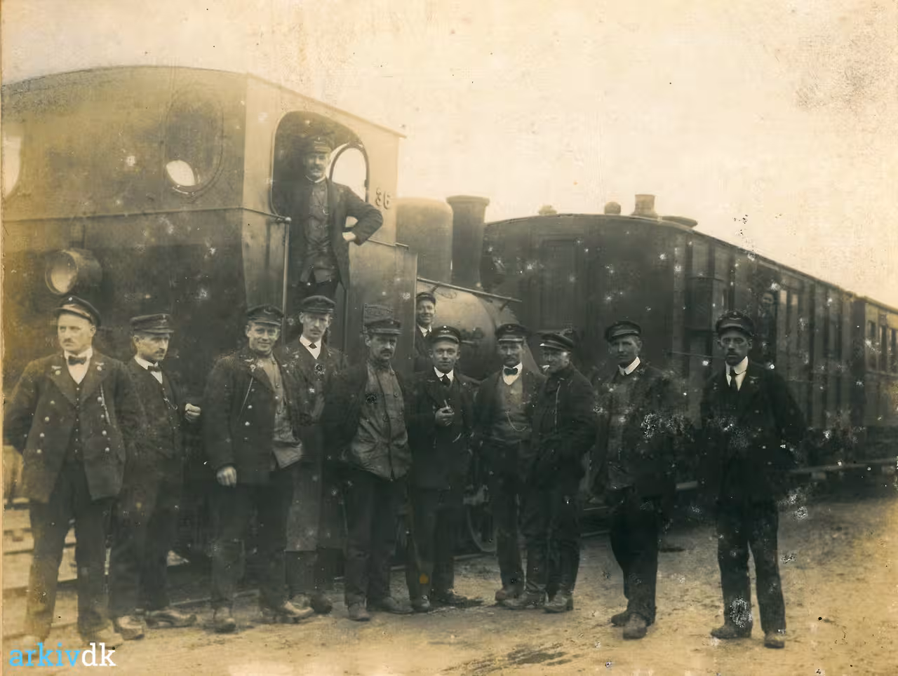 Banepersonale foran rangerlokomotiv i Svendborg ca. 1920. Fotograf ukendt. Svendborg Byhistoriske Arkiv - Nummer: B12880. "Klikbart" foto.