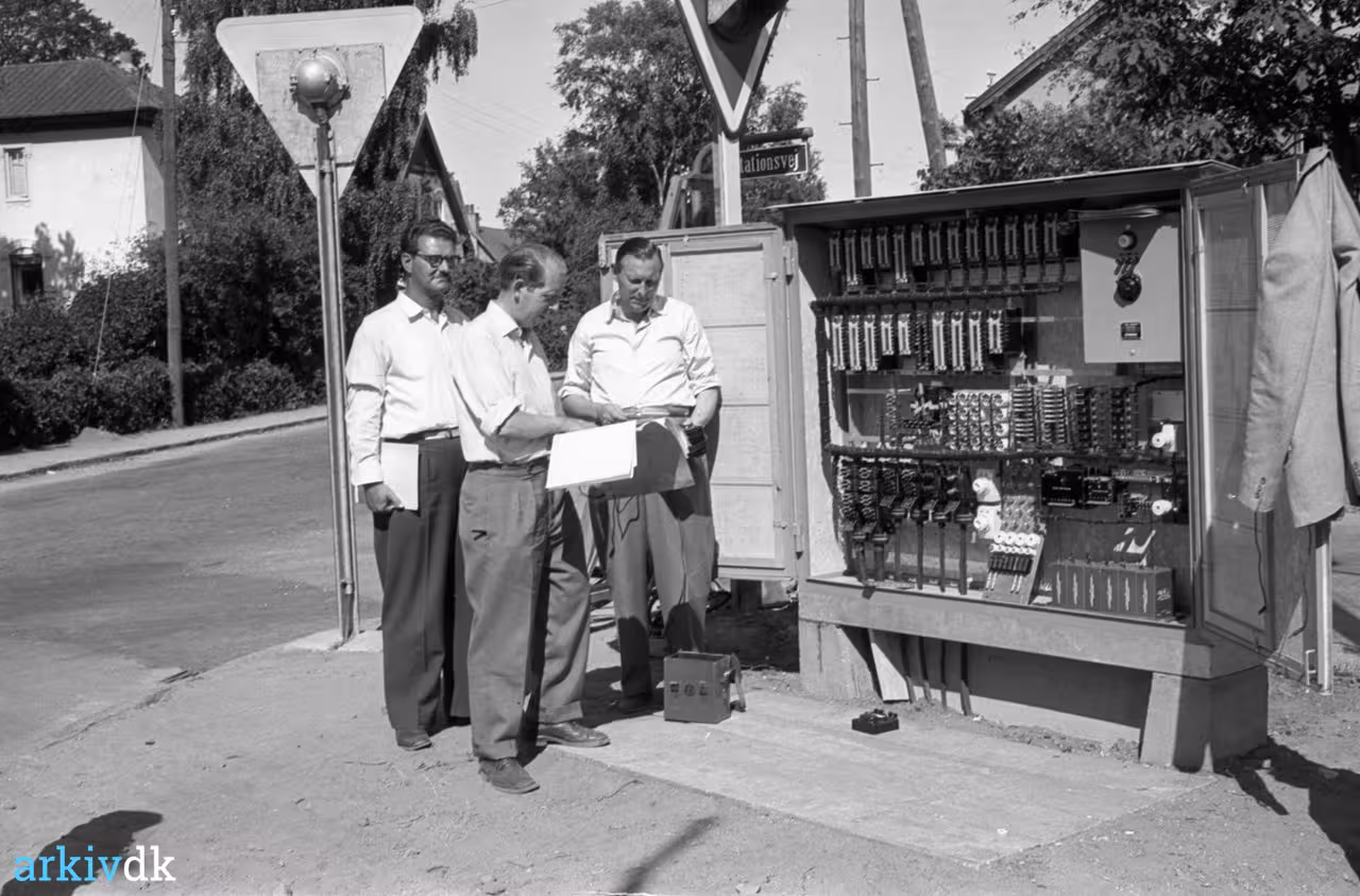 Automatisk bom i Hjallese, august 1955. Svendborgbanens overskæring på Odensevej i Hjallese fik i 1955 opsat en automatisk bom samt klokke og rødt blinklys, så trafikanterne ikke var i tvivl, når der kom tog. Her ses sektionsingeniør K.A.M. Jensen (til venstre) fra 2. distrikt, signalingeniør V. Farring (i midten) fra generaldirektoratet og oversignalmester Vibjerg Petersen (til højre) samlet foran kontrolskabet.